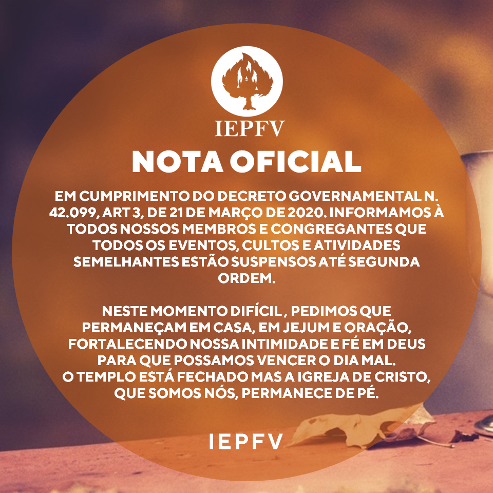 Devido ao cumprimento do decreto governamental de isolamento social, as atividades presencias da igreja estão suspensas temporariamente. Confira o comunicado oficial abaixo: